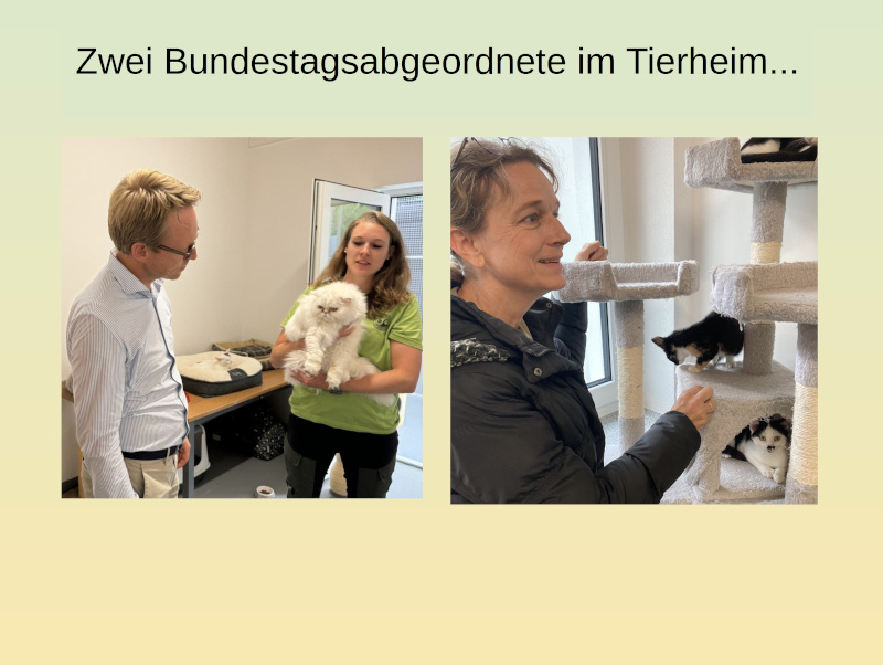 17.09.2024In diesem Herbst steht im Bundestag eine Änderung des Tierschutzgesetzes an, die auch Auswirkungen für den Tierschutz hier vor Ort haben wird. Das war uns Anlass, die Bundestagsabgeordneten unseres Wahlkreises in unser Tierheim einzuladen, um sie über die Themen zu informieren, die uns Tierschützer unter den Nägeln brennen, und die im Entwurf des neuen Tierschutzgesetzes leider nur unzureichend Beachtung gefunden haben. Der CDU-Bundestagsabgeordnete Marc Henrichmann und die Bundestagsabgeordnete der Grünen, Frau Dr. Anne Monika Spallek, waren unserer Einladung gefolgt.