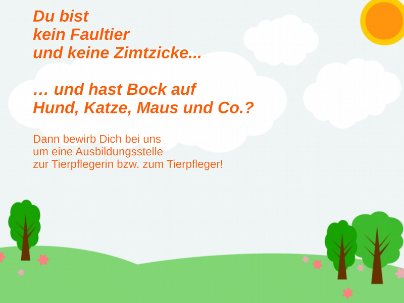 Und falls Du Dir noch nicht sicher bist, ob der Beruf der Richtige für Dich ist, dann mach' ein Praktikum bei uns und lerne so den Tierheimalltag kennen. (Tel: 02541 900 988 4)