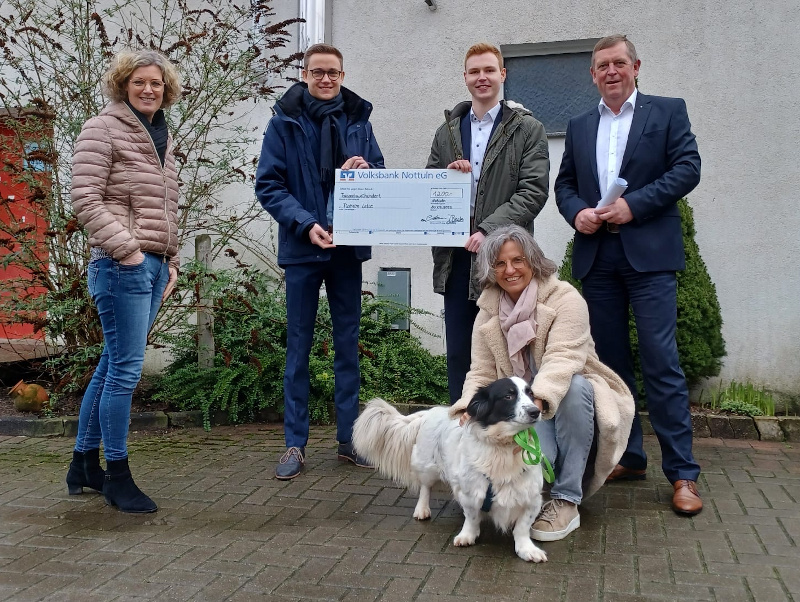 Zwei der Azubis, ihre Ausbildungskoordinatorin Frau Temming und der Prokurist Herr Volmer besuchten uns heute im Tierheim Lette, um uns den beachtlichen Spendenscheck zu überreichen.