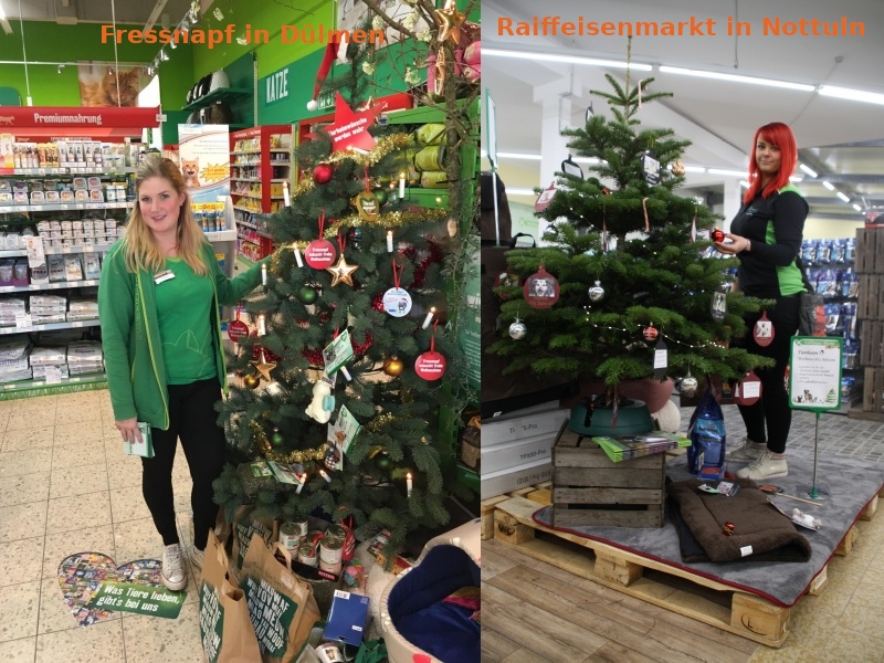 Der Fressnapf in Dülmen und der Raiffeisenmarkt in Nottuln haben in ihren Geschäftsräumen jeweils einen Tannenbaum mit Wunschkugeln aufgestellt.