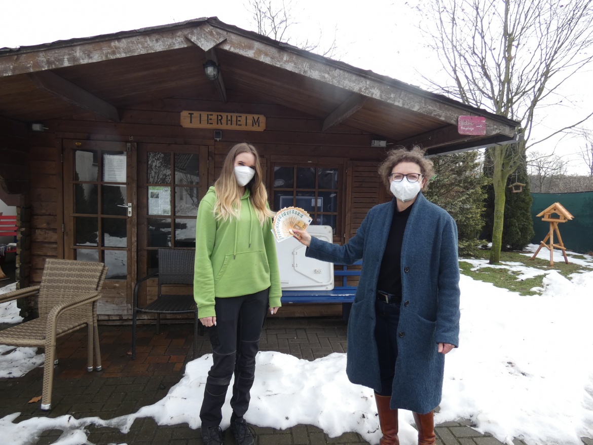 17.02.2021Die Freude war groß am Tierheim, als unsere Tierpflegerin Denise Lupp aus den Händen unseres Vorstandsmitglieds Sarah Bosse eine riesige Spende in Höhe von 1.000€ entgegennehmen konnte, die diese im Namen der Organisatorinnen der Kinderkleidermarktes in Billerbeck überreichte. Die Vertreterinnen des Kleidermarktes wollten eigentlich persönlich zum Tierheim kommen, um die Spende zu überreichen, haben davon aber wegen der besonderen Situation in Corona-Zeiten abgesehen. Sarah Bosse hat den Betrag in deren Namen natürlich gern übermittelt.