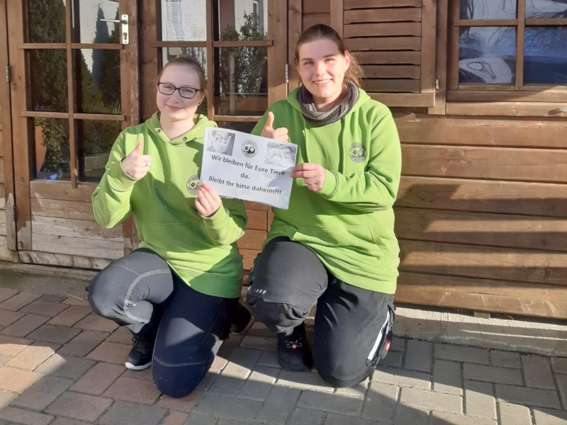 Auf dem Foto Anne Baltus (re.) und Jessica Brink (li.) vom Team A, die sich diese Woche um unsere Schützlinge kümmern und Euch bitten, zum Wohle aller daheim zu bleiben.