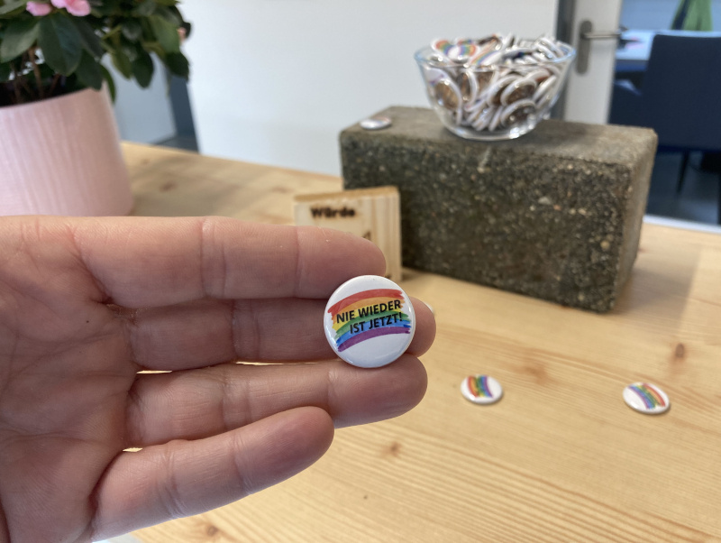 Wer mag, kann sich gerne im Tierheim einen passenden "Nie wieder ist jetzt!" -Anstecker abholen.