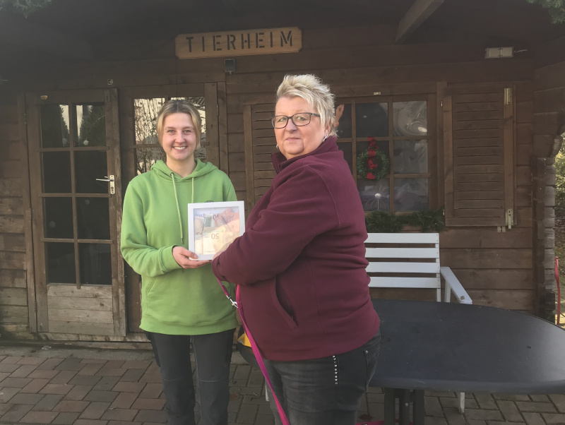 28.12.2022Kurz vor Heilig Abend besuchte uns Andrea Margies, Bezirksleiterin der Bäckerei Middelberg, und überreichte uns einen wertvollen Bilderrahmen. Darin befanden sich dicht an dicht gedrängt zahlreiche Geldscheine. Sagenhafte 500 € hatten die Mitarbeiter und Mitarbeiterinnen aller Filialen für unsere Tiere gesammelt.