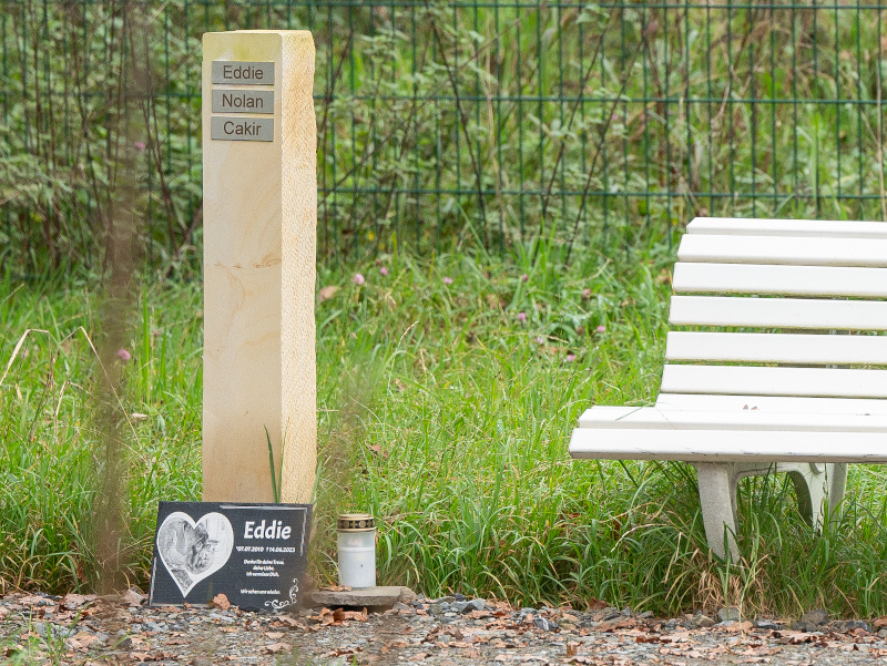Wir möchten nun den Menschen aus unserem Zuständigkeitsbereich eine weitere Lösung anbieten: Ohne Kosten kann man die Asche des Haustieres auf der Naturwiese an unserem Tierheim verstreuen, und wer mag, kann gegen einen Unkostenbeitrag von 10 Euro über das Tierheim eine kleine Plakette mit dem Namen des Tieres bestellen, welche dann einer schönen Sandstein-Stele in der Wiese befestigt wird. Eine Bank neben der Stele lädt zum Verweilen ein.