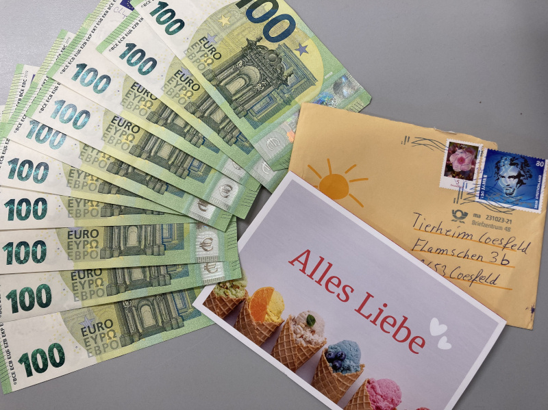 Aus einer hübschen Grußkarte rieselten zehn 100€-Scheine als anonyme Spende heraus. Gerade in der jetzigen Situation, wo uns finanziell das Wasser bis zum Hals steht, erscheint uns diese Spende wirklich als ein Geschenk des Himmels.