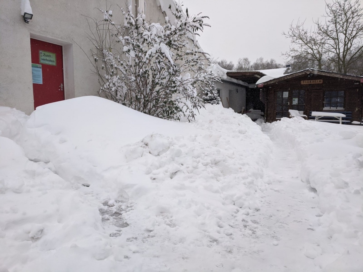 08.02.2021Die diensthabenden Tierpfleger/innen hatten wirklich große Mühe, durch die Schneemassen zum Tierheim zu gelangen. Die Straße zum Tierheim war nicht befahrbar. Von der Hauptstraße aus ging es zu Fuß zum Tierheim weiter. Aber die Tiere mussten ja schließlich versorgt werden.