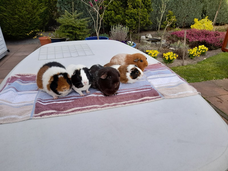 nach längerer Zeit meldet sich das Meerschweinchen Leyla (ehemals Clair), das ich im Oktober 2020 adoptiert habe, mal wieder. Wie auf dem Foto zu sehen, geht es Leyla (2. Von links), sehr gut. Und sie sehen auch, dass sie mittlerweile zu 5. Leben. Das neue Schweinchen ist die 9 Jährige Elsa (2. Von rechts). Alle vertragen sich super gut und die 5 genießen ihr freies Leben auf 268 qm Gartenfläche in Offenstall Haltung.