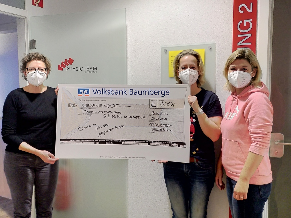 22.12.2020Am heutigen Dienstag konnte unsere Schriftführerin Sarah Bosse eine Spende in Höhe von 350€ vom Physio-Team Billerbeck entgegennehmen. Das Team hatte in der Adventszeit Spenden gesammelt, die zu gleichen Teilen an den Verein "Kids mit Handicaps" und an unser Tierheim gingen. Die stolze Summe von 700€ war zusammengekommen.