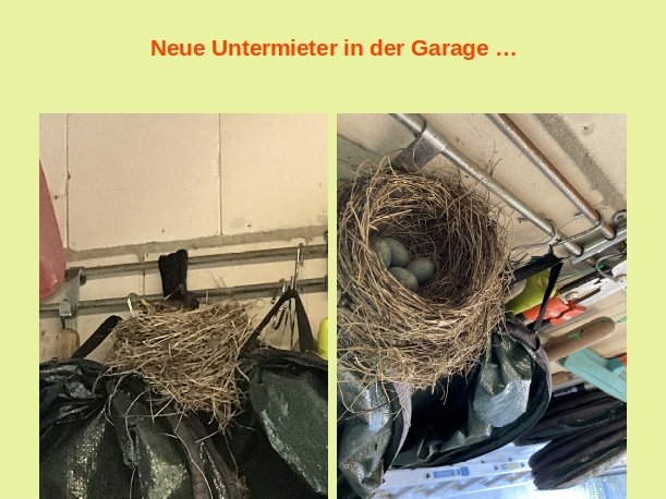 23.04.2021Es ist nur ein kleines Vogelnest, aber sein Anblick bringt dem Garagenbesitzer jeden Tag viel Freude im Corona-Alltag.