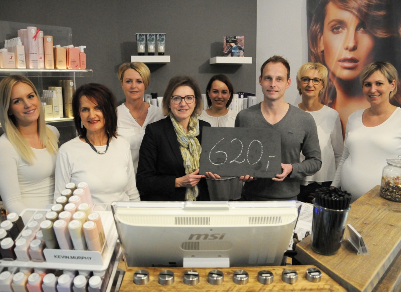 Das Team um Chefin Karen Stückenschneider (ganz rechts auf dem Foto) hatte zu Weihnachten eine Spendenaktion durchgeführt, bei der es Haarpflegeprodukte in Probiergröße verkaufte. Der gesamte Erlös in Höhe von insgesamt 620 € kommt nun neben der Kinderkrebshilfe Münster auch unserem Tierheim zugute.