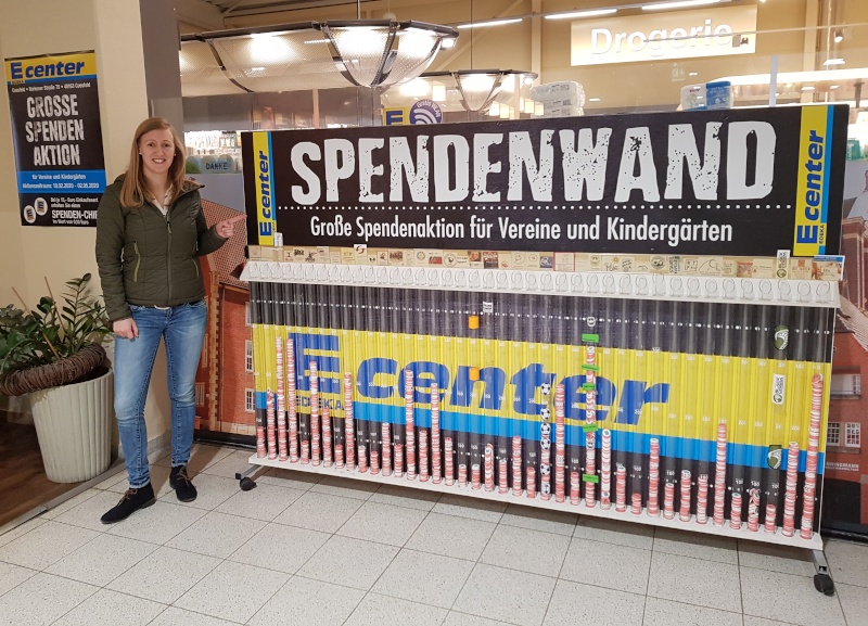 17.02.2020Beim Edeka-Center Coesfeld läuft momentan eine tolle Spendenaktion. Pro 15,- Euro Einkaufswert erhält man an der Kasse eine Plastikmünze im Wert von 0,10 Euro, die man für einen Verein seiner Wahl an der eigens errichteten Spendenwand hinter den Kassen einwerfen kann. Unsere 2. Vorsitzende Verena Ostendorf hat dafür gesorgt, dass auch unser Verein dort vertreten ist.