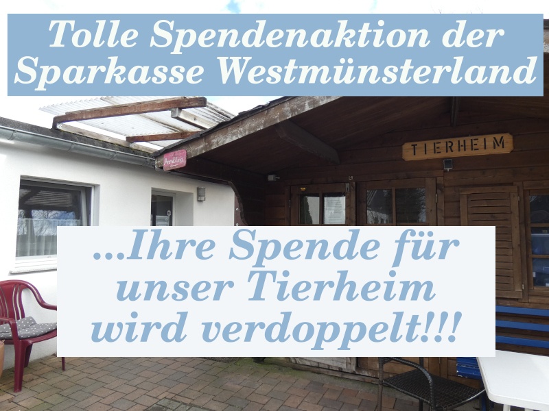 D.h., wenn Sie uns unter dem unten angegebenen Link eine Spende zukommen lassen, um unser Tierheim bei Tierarzt-, Energie- oder Futterkosten zu unterstützen, dann verdoppelt die Sparkasse den Betrag.