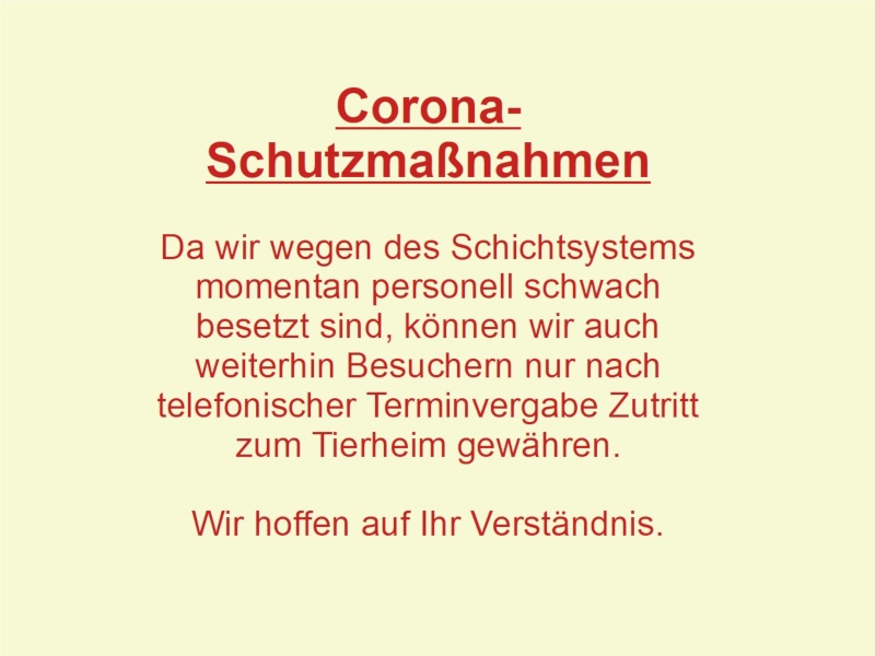 08.05.2020Weil wir es uns nicht erlauben können, dass unser Personal bei einem möglichen Coronafall komplett ausfällt und die Tiere unversorgt wären, haben wir ein Schichtsystem eingeführt, bei dem zwei Gruppen ohne Kontakt zueinander im wöchentlichen Schichtwechsel arbeiten. Dadurch ist aber jeweils nur die halbe Besetzung im Dienst und wir können bei gutem Wetter oder am Wochenende unter Umständen den Besucheransturm nicht bewältigen. Daher bitten wir Sie, Ihren Besuch mit dem Tierheimpersonal telefonisch abzustimmen.