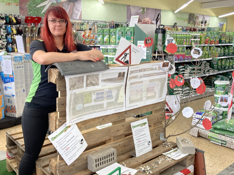 Foto: Frau Wozniak vom Raiffeisenmarkt Nottuln, die die Aktionsfläche liebevoll gestaltet hat.