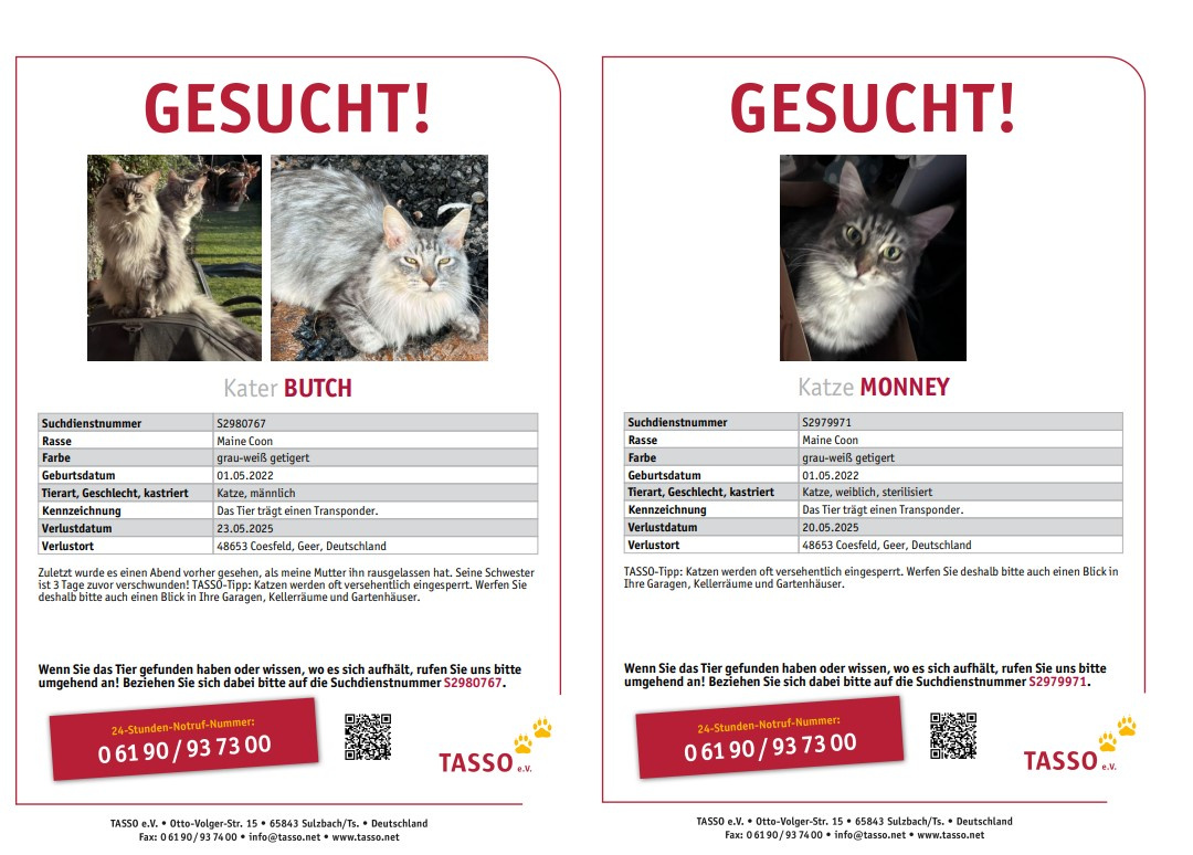 Folgende Tiere wurden von ihren Besitzern als vermisst gemeldet.