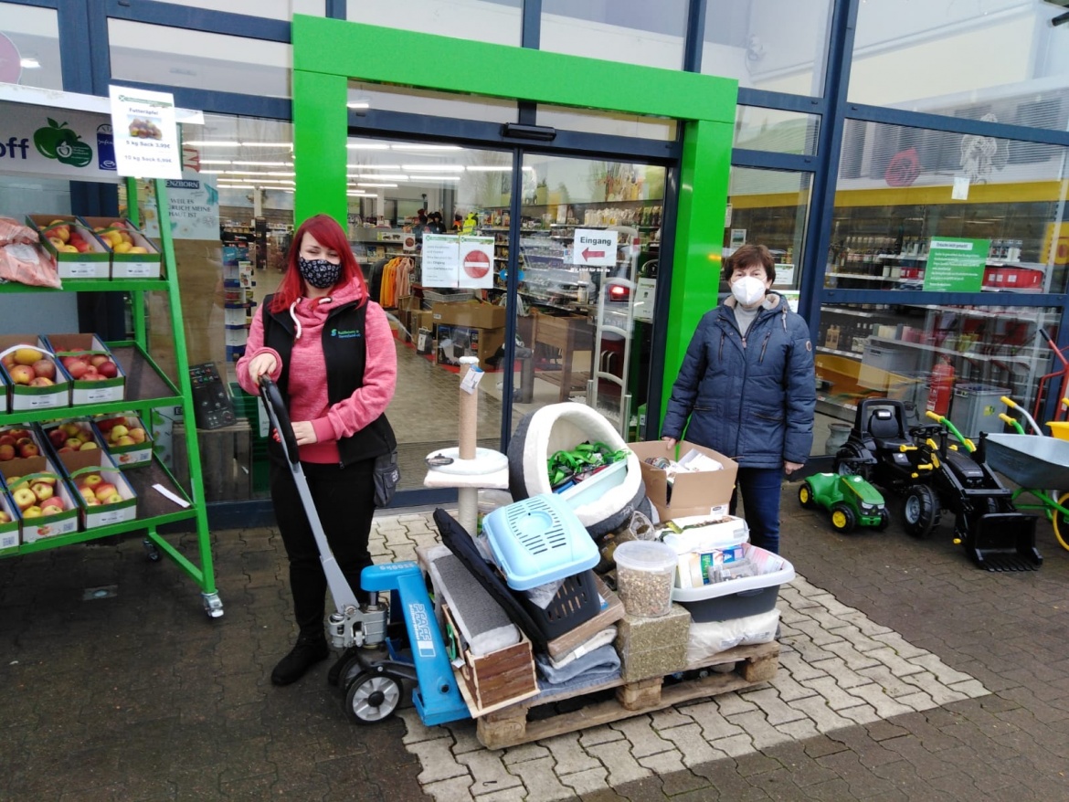 Foto: Frau Wozniak (l.)vom Raiffeisenmarkt in Nottuln und Frau Sicking (r.) vom Vorstand unseres Vereines bei der Abholung der Spenden