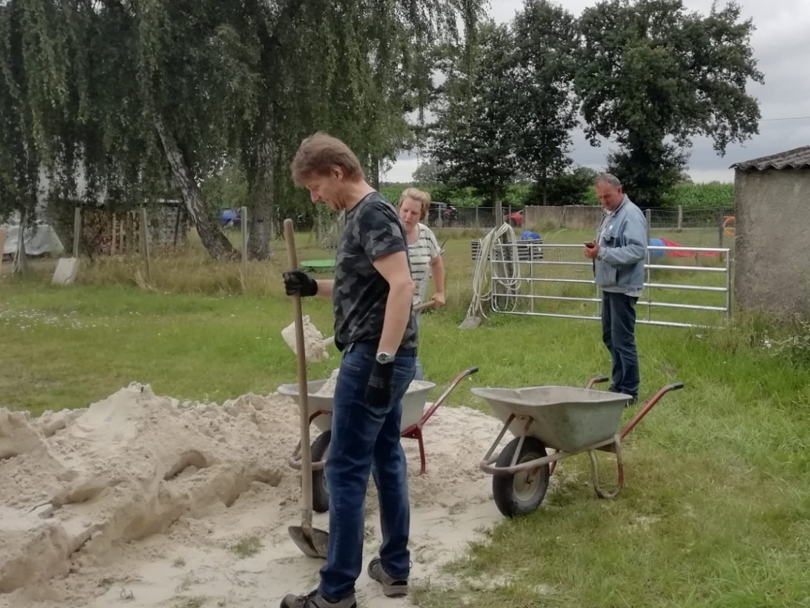 Einige ehrenamtliche Helfer und Mitglieder des Vorstandes opferten ihren freien Samstag, um mit vereinten Kräften 4 Kubikmeter Sand in die Hundeausläufe zu schaufeln.