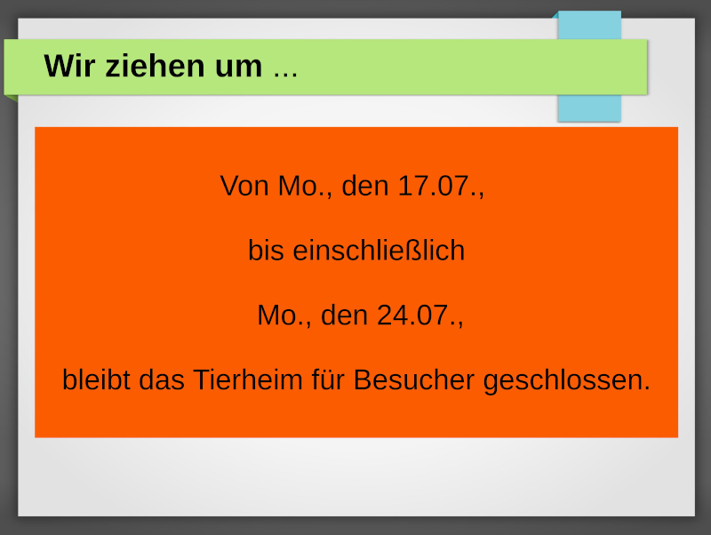 Für die Aufnahme von Fundtieren und Notfällen stehen wir Ihnen natürlich auch in der Woche des Umzuges zur Verfügung und sind über die Telefonnummer 02546 7060 zu erreichen.