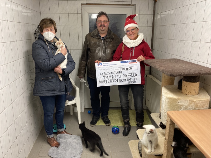 Und als Frau Fimpeler- Schoof - heute, am 6. Dezember, passend mit einer Nikolausmütze bekleidet - einen Scheck in Höhe von 3.000,- € (!!!!) aus ihrem imaginären Nikolaussack zog, hob es Frau Sicking und Frau Kassenböhmer vom Vorstand vor Freude beinahe aus den (Nikolaus-) Socken. Hatten im letzten Quartal doch außergewöhnlich hohe Tierarztrechnungen ein gewaltiges Loch in der Tierheimkasse hinterlassen und große Sorgen bereitet....