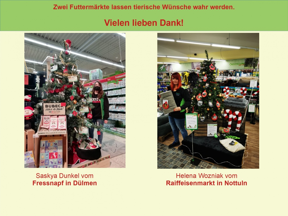 28.11.2020Die Tiere in unserem Tierheim haben den Pflegern/innen ihre Wünsche für Weihnachten ins Ohr geflüstert und der Fressnapf in Dülmen sowie der Raiffeisenmarkt in Nottuln haben nun die tierischen Wunschzettel in ihren Filialen an einen Wunschbaum geheftet.
